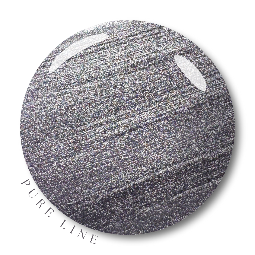 A graphite silver with a violet undertone. The high-shimmer finish gives it a multidimensional, mirrored depth.