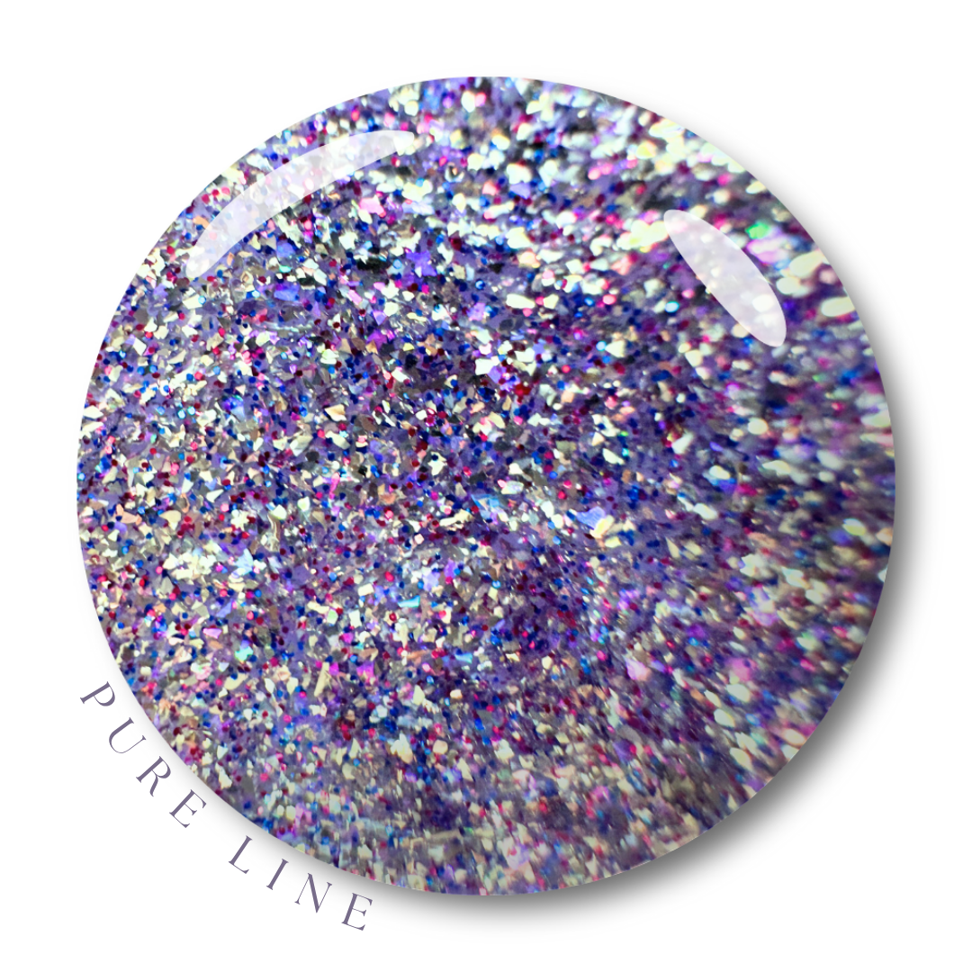 A bright lavender base exploding with cool-toned glitter in violet, periwinkle, and silver. Flashes of fuchsia and icy blue create a high-shine, iridescent effect.